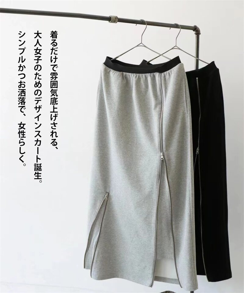 日系四季百搭新款女装 女式下装长拉链不对称修身半身裙纯色