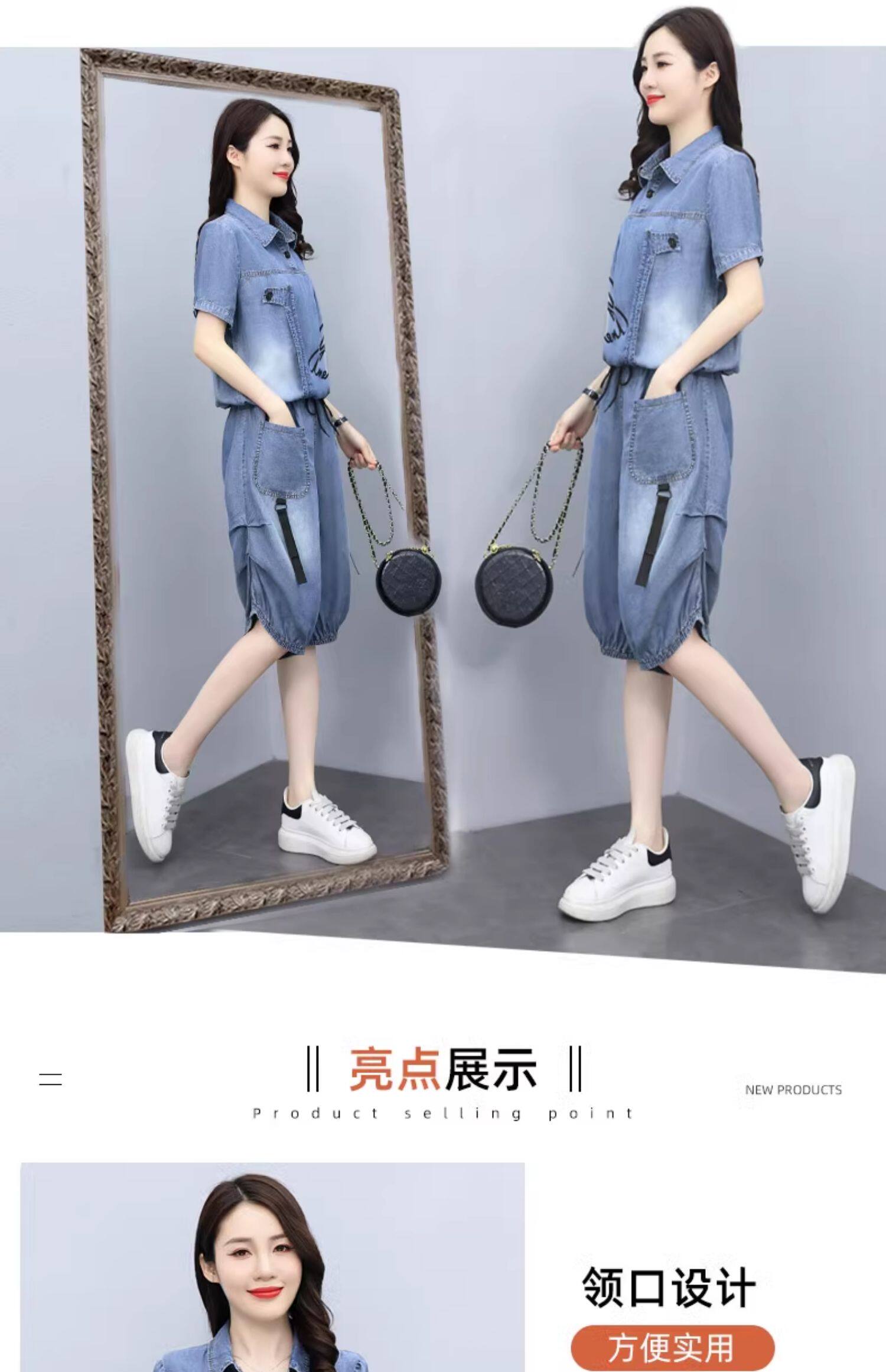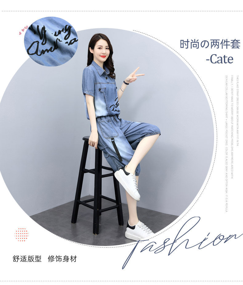 冰丝牛仔休闲时尚套装女夏季新款七分裤洋气质减龄短袖短裤两件套